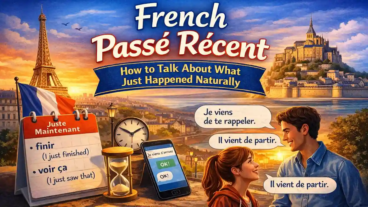 Ever notice how beginners can talk about yesterday and tomorrow but get stuck on “just now”? That gap makes your French feel jumpy. Passé récent fixes that gap. It lets you speak from the present moment backward by a few seconds or minutes, which is how real conversations actually work. Once you use passé récent, your French stops sounding reported and starts sounding lived in. In this guide, I’ll show you how to build it cleanly, how to use it in real speech, where learners mess up, and how to blend it with futur proche and futur simple so your timing flows.
